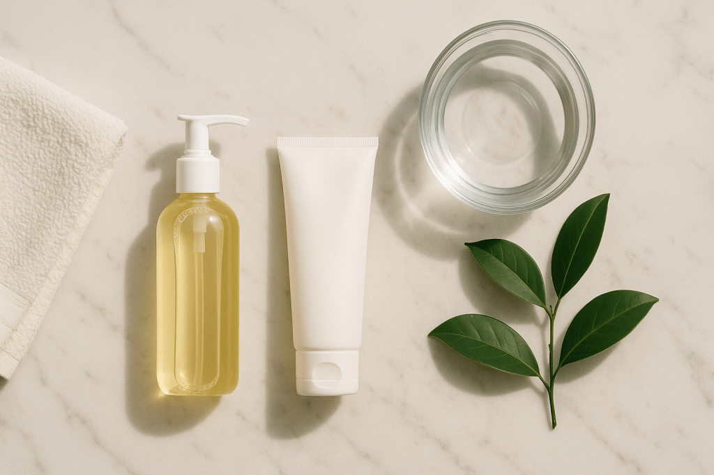 - Oil cleanser: Gentle balms or milky oils with soothing ingredients like chamomile or squalane.