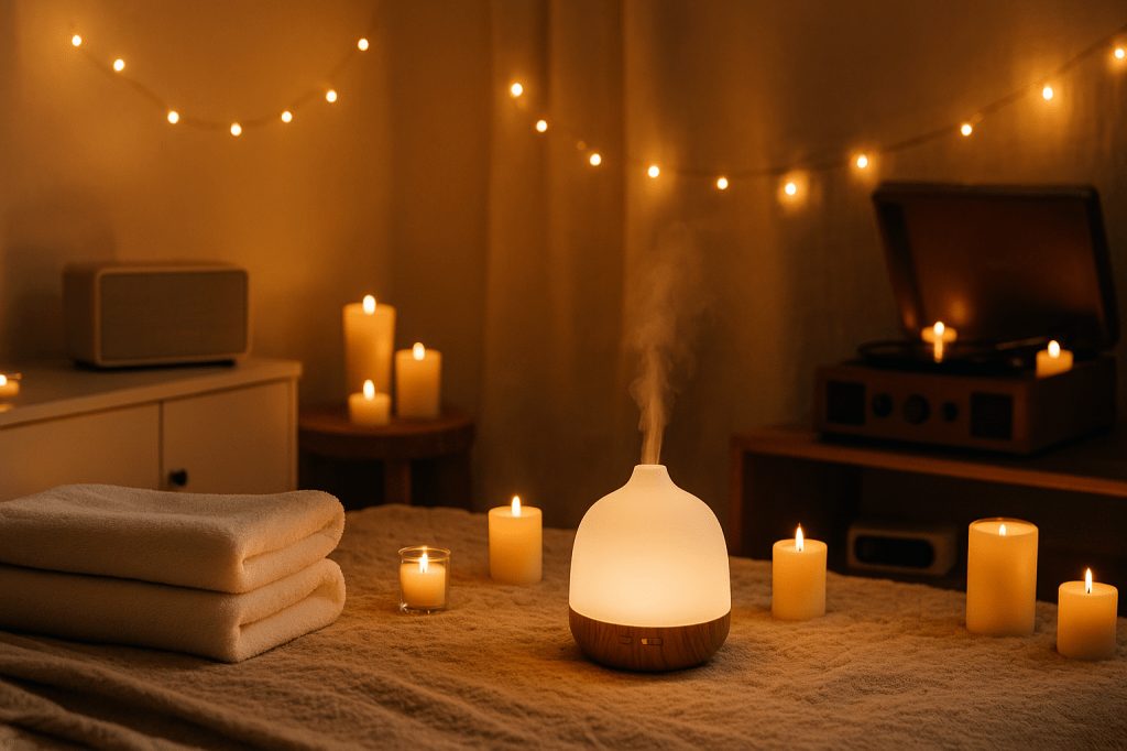 The environment matters just as much as the oils themselves. Transform any room into a sanctuary by dimming the lights and introducing soft, ambient lighting — think candles or string lights that cast a warm glow. Background music enhances the atmosphere, so choose something soothing that you both enjoy.