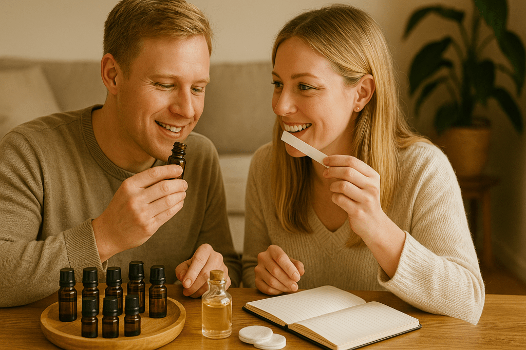 Never apply undiluted essential oils directly to skin — they’re highly concentrated and can cause irritation. If either partner is pregnant, has medical conditions, or takes certain medications, consult a healthcare professional before using specific oils, as some have contraindications.