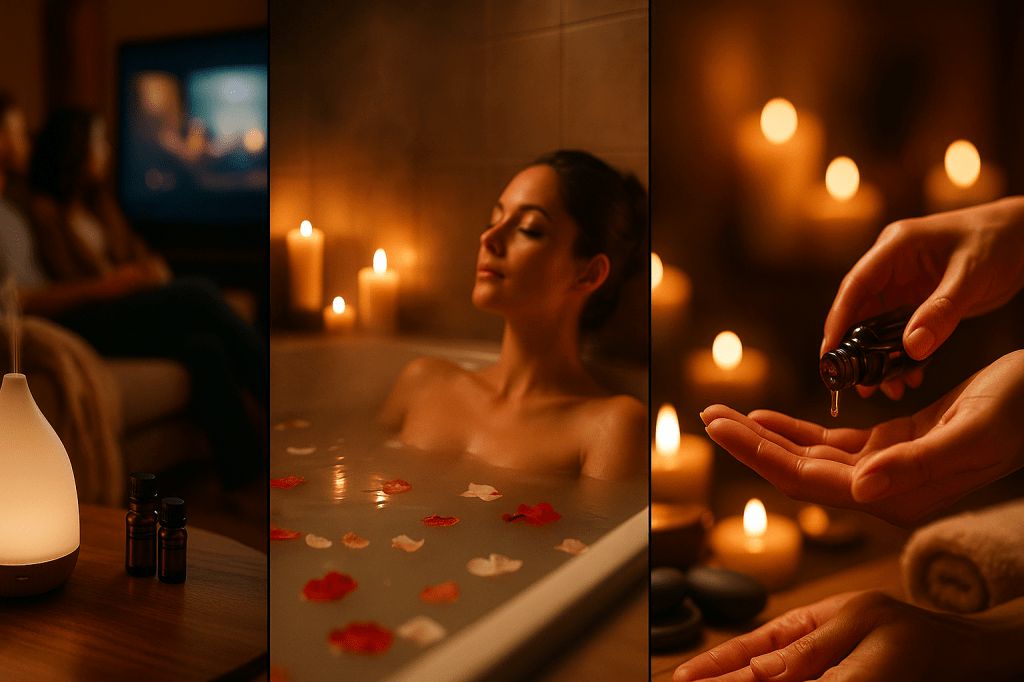 Diffusion is the simplest method. Add five to eight drops of your chosen oil or blend to a diffuser filled with water and let it scent your space. This works perfectly for movie nights, dinner dates at home, or simply relaxing together.