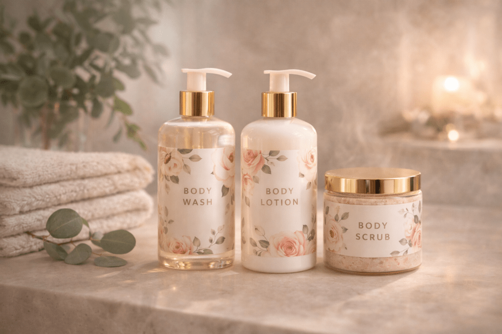 Look for sets that include body wash, body lotion, scrub, with romantic scents like rose, jasmine, or vanilla.