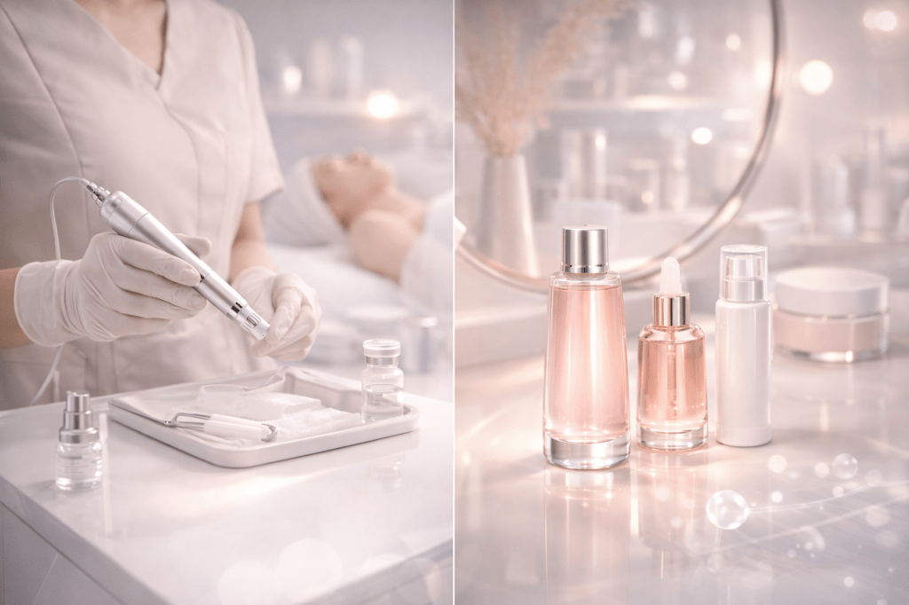 - Microneedling with PDRN: Tiny needles create micro-channels in the skin while PDRN serum is pressed in for deeper absorption. Ideal for overall texture and tone. Redness typically resolves within 1–3 days.