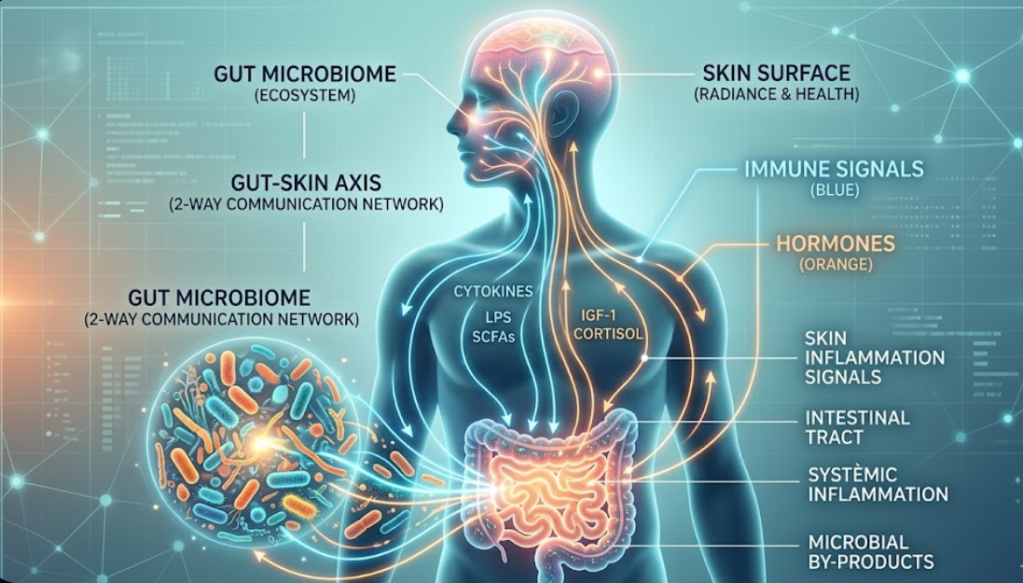- The gut–skin axis is a real, two-way communication system with growing clinical evidence behind it