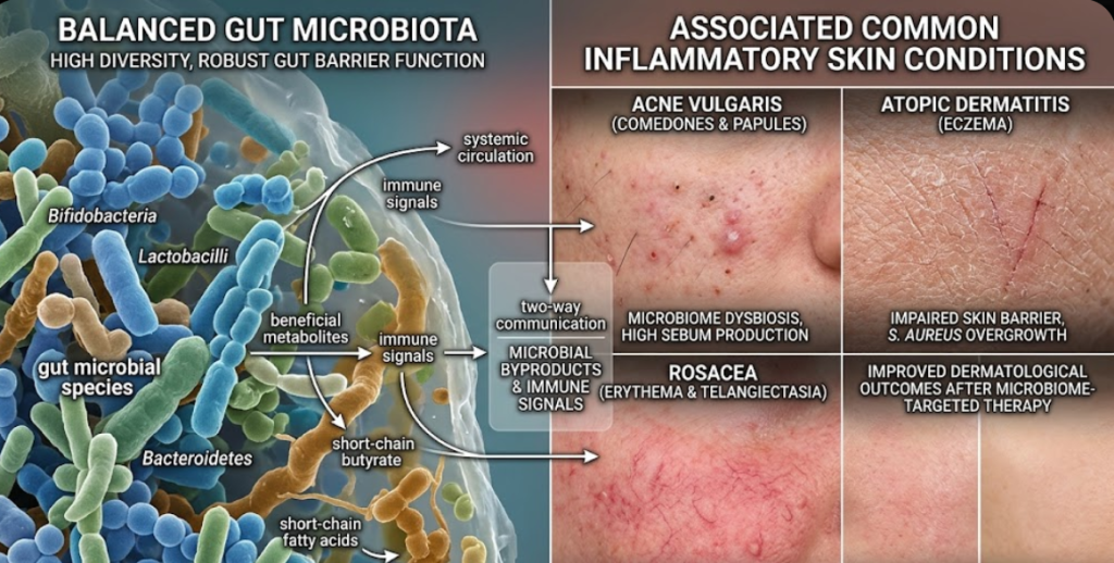 Research published up to 2025 has strengthened the link between gut dysbiosis and several common inflammatory skin conditions, including: