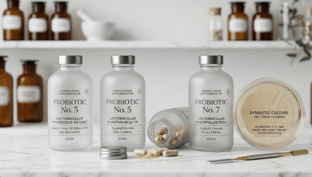 - Choose strain-specific supplements with published research behind them — not generic “beauty probiotic” products